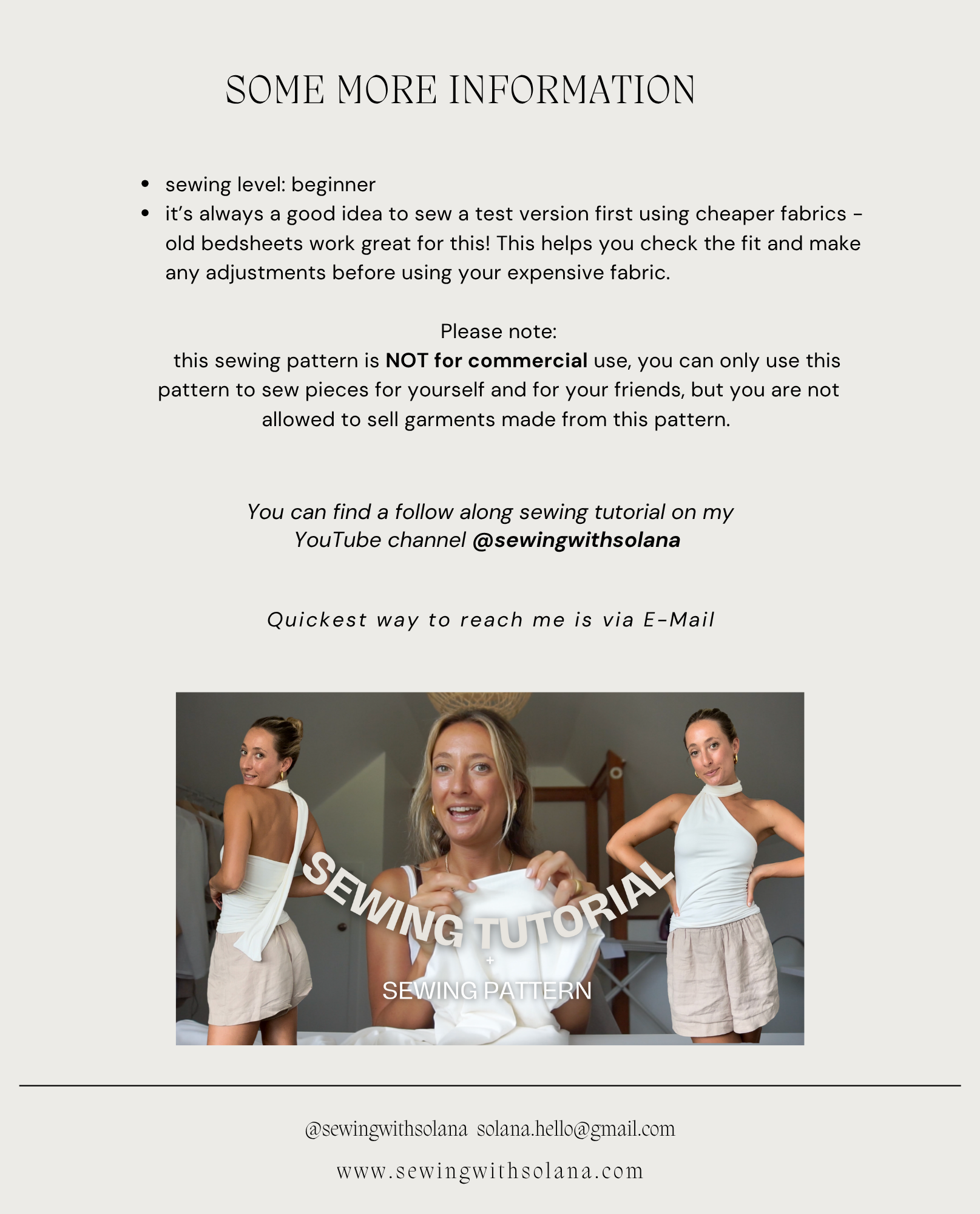 1. the sewing pattern does not come with written instruction, instead you will find a in depth sewing tutorial on YouTube (click here to see video).